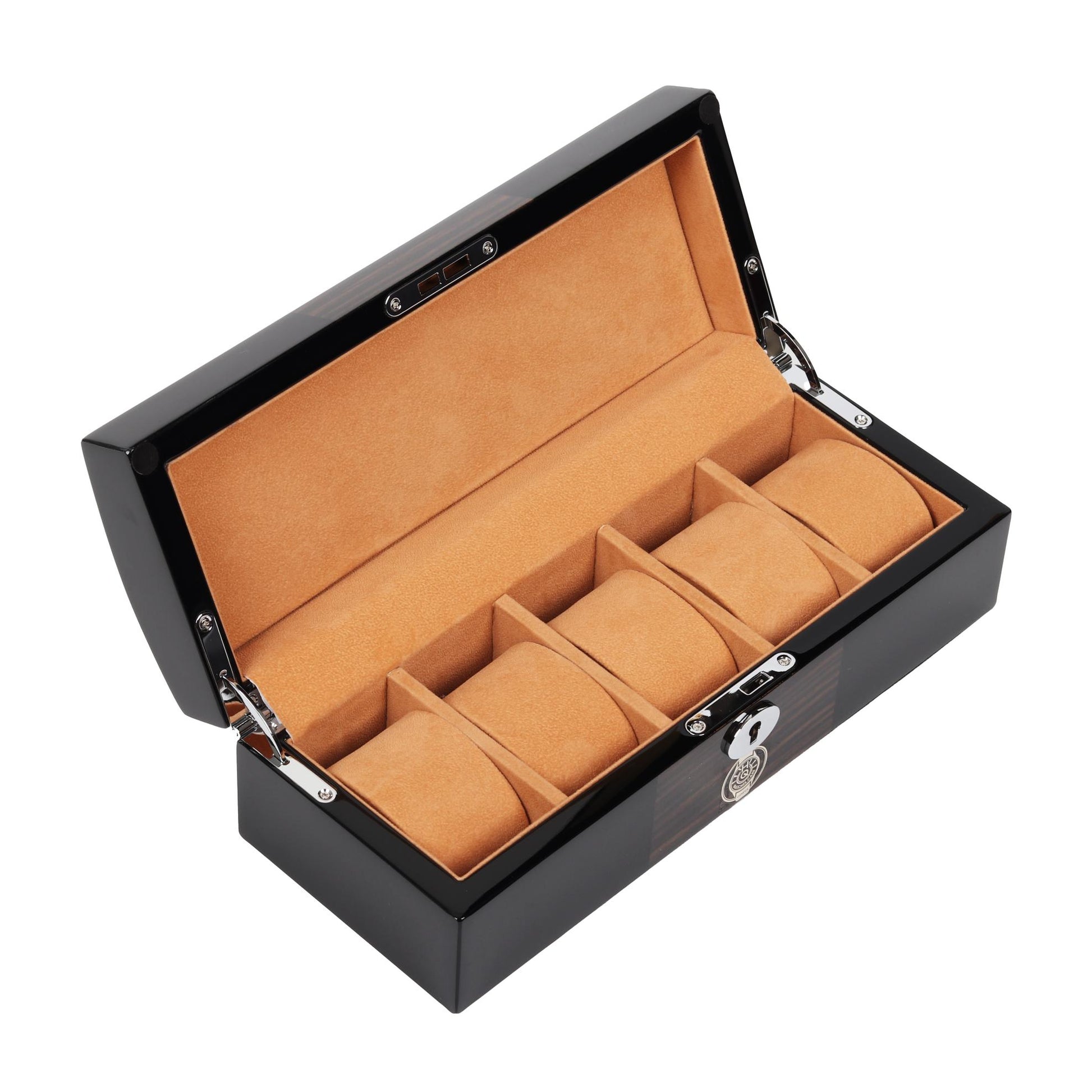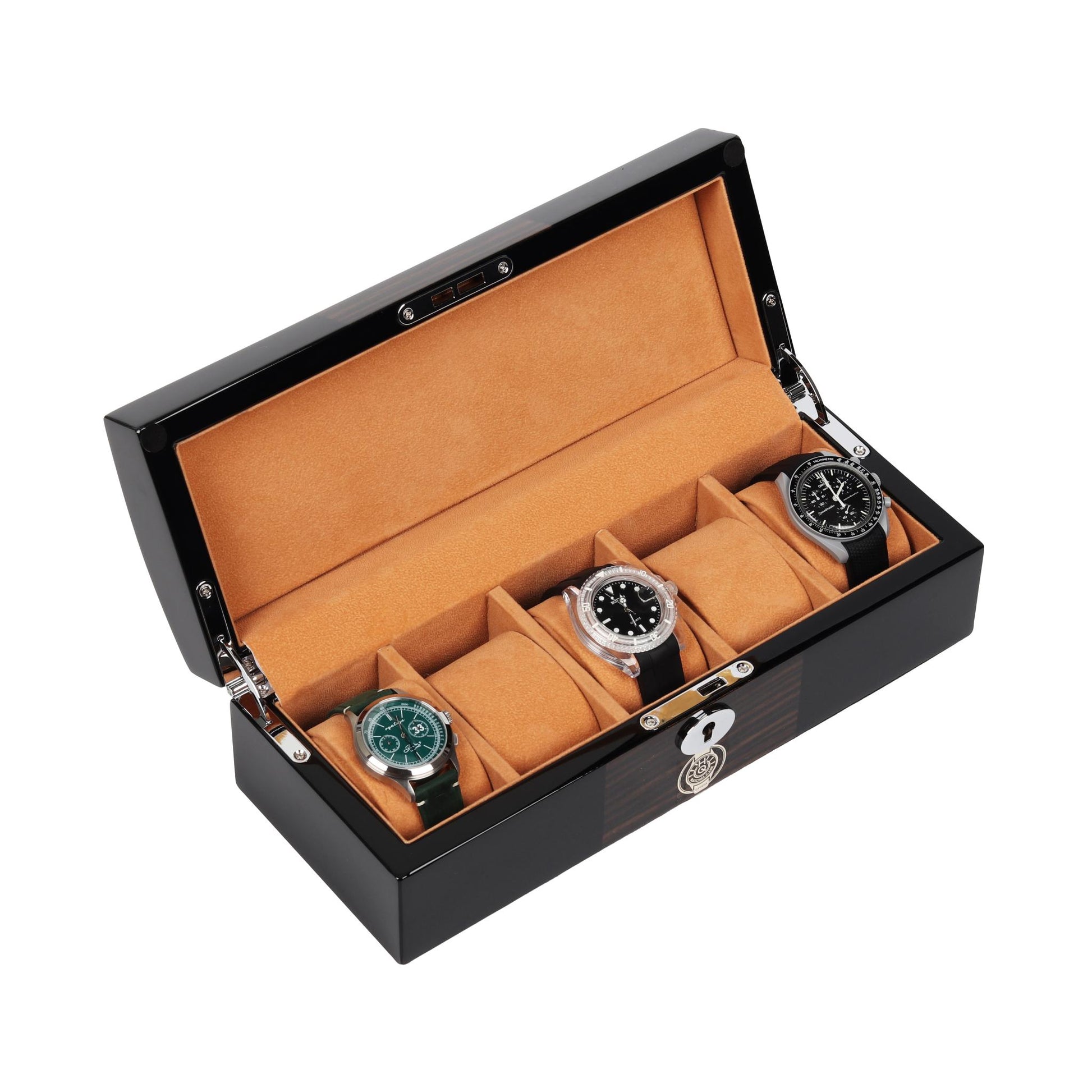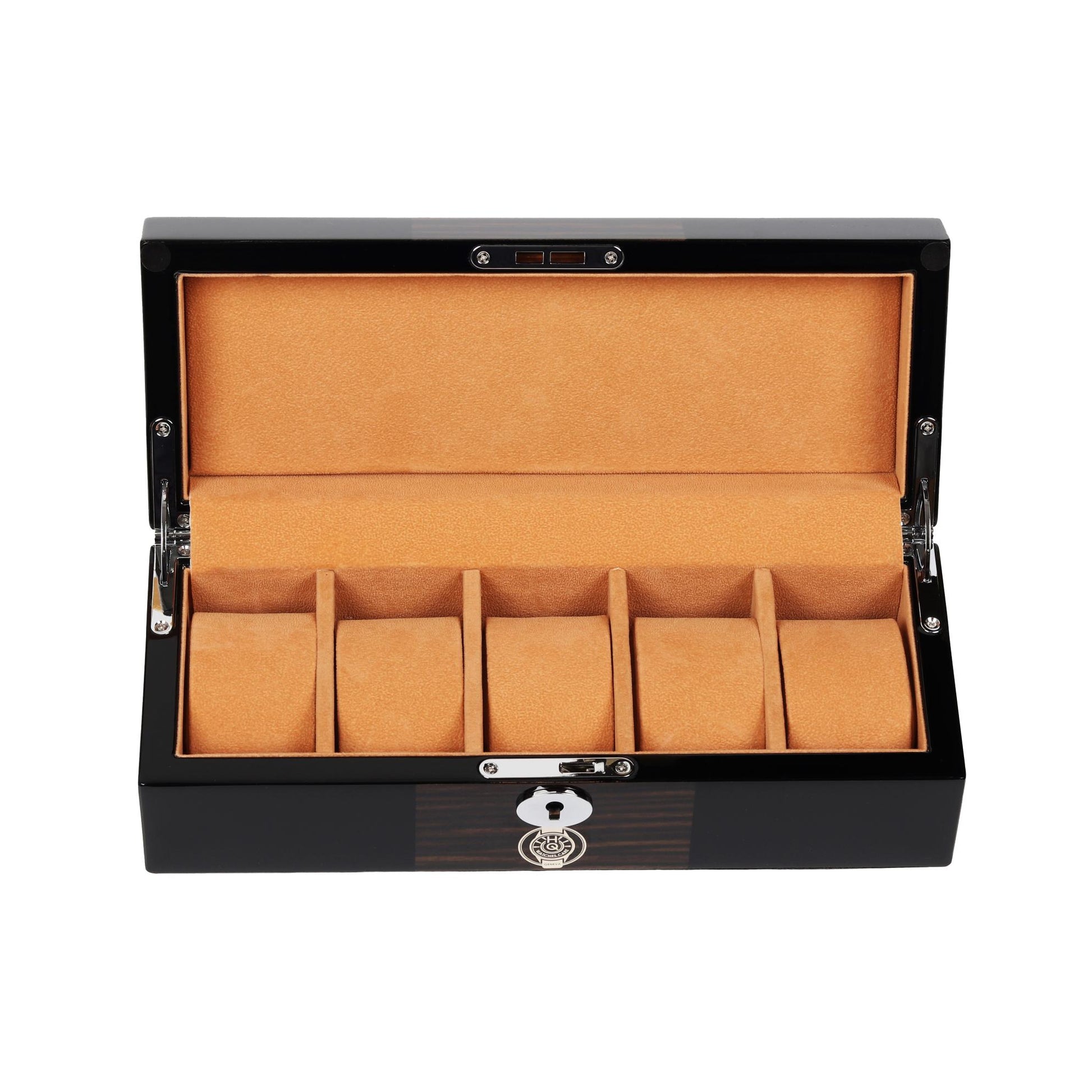 HQ Watches Care Luxury 5-Watch Wooden Organizer: Elegant with Soft Orange Suede Interior High-End Premium Watch Organiser Case for Men and Women, Jet Black